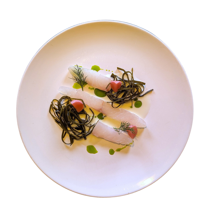 Die fünf Gänge sind so angelegt, dass unterschiedliche Teile, Schnitte und Zubereitungen nacheinander erfahrbar werden. Dadurch entsteht kein klassisches Menü mit gleichförmigem Verlauf, sondern eine Abfolge, die den Fisch aus mehreren Perspektiven lesbar macht.