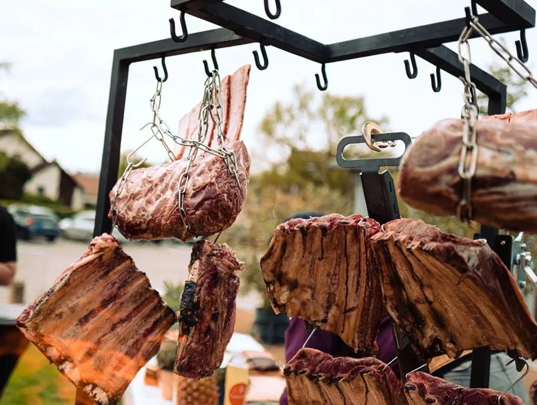 Ein entspannter Tag im Innenhof mit Wagyu vom Feuer, Wein und offenen Flammen.